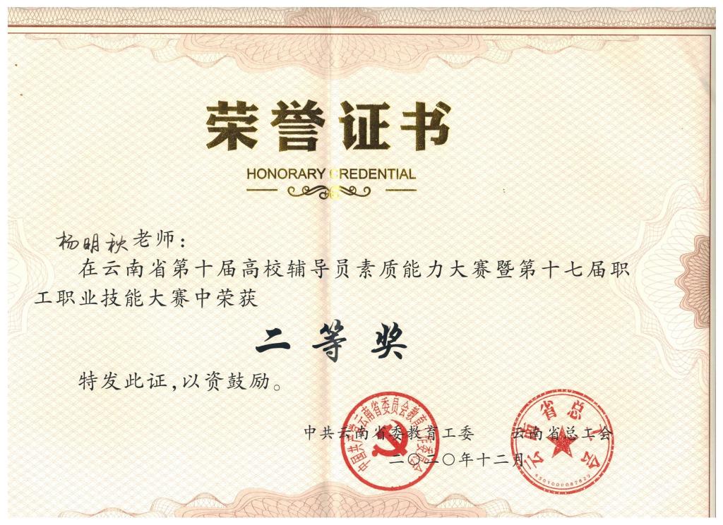 玉溪师范学院学生处杨明秋老师代表学校参加比赛,经过大赛基础知识测试、案例研讨和谈心谈话等三个环节的角逐,最终斩获二等奖。