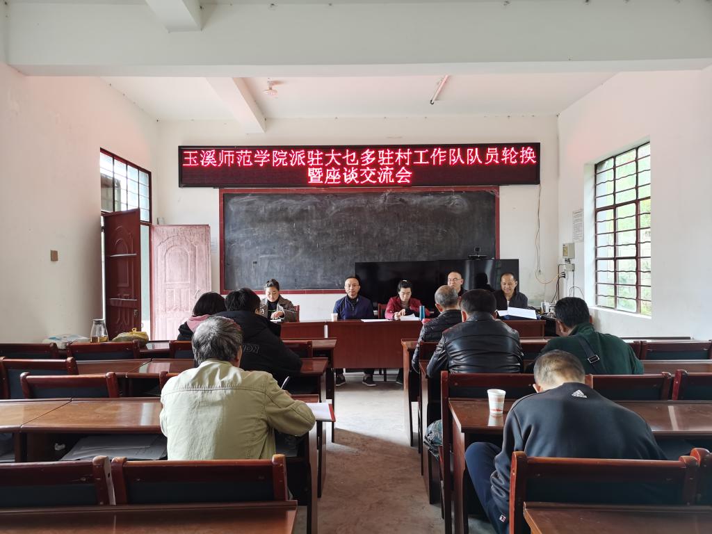 当天下午,在大乜多村会议室举行了“玉溪师范学院派驻大乜多村工作队员轮换暨座谈交流会”。会议由大乜多村驻村第一书记、工作队长沐士光主持,他对两位调整回校的队员驻村以来的辛勤付出表示感谢,对新队员的到来表示欢迎。座谈会上,组织部副部长沙蓉传达了中共云南省委组织部关于同意我校更换驻村扶贫工作队员的通知精神;学校扶贫办主任胡飞对驻村工作队的工作纪律做了相关要求;被轮换的老队员代表余为兵作告别大乜多发言,新队员褚小波、方波作表态发言;随后,大乜多村民委员会主任金彩辉汇报了大乜多村的村情、民情及脱贫攻坚取得的成绩;最后,参加座谈会的全体成员畅所欲言,对脱贫攻坚工作进行了深入的交流沟通。