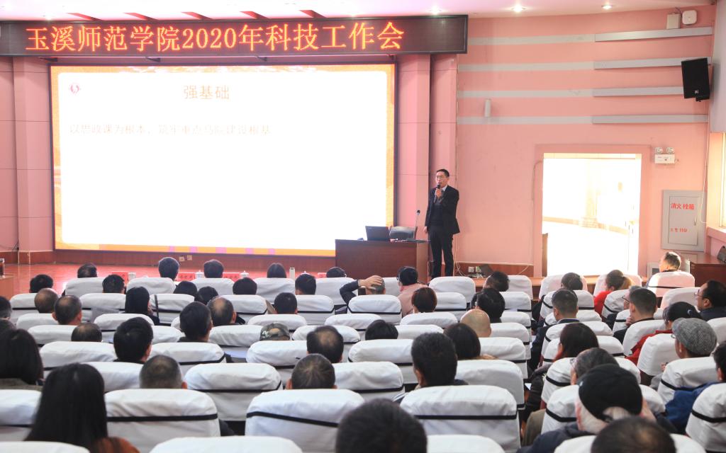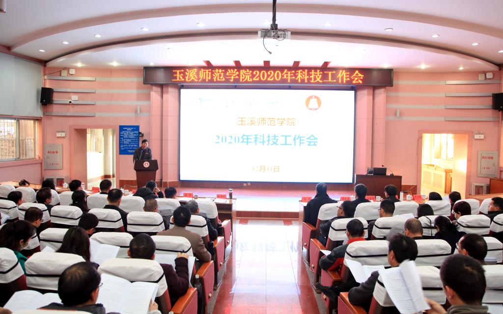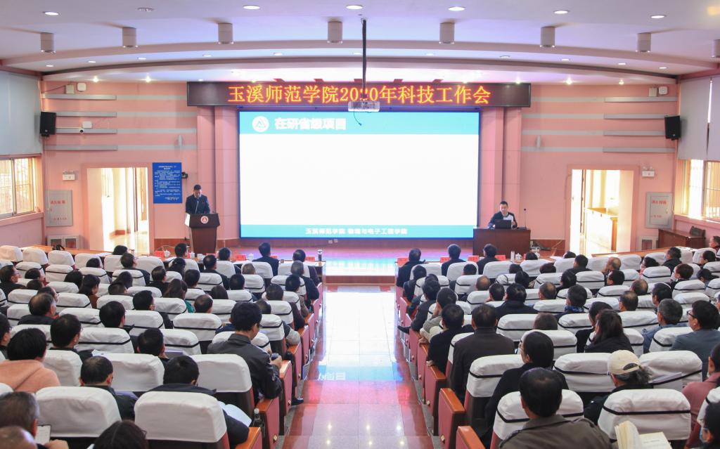 12月11日,玉溪师范学院2020年科技工作会在科学讲堂如期举行。会议以“面向地方发展新需求、激发科技创新新动力,全面开创一流地方应用型大学建设新征程”为主题,全面总结学校2020年科技工作成效,交流分享科研工作经验,深入分析当前和今后一段时期学校科研工作重点,明确下一步科研工作思路,安排部署2021年科研工作,征求了《玉溪师范学院科学研究成果级别认定办法》等文本的意见建议。校外领导、专家,学校党政领导,学术委员会成员,各学院、职能部门副处级以上干部、教授、博士、科研秘书,科技处及发展规划与研究中心全体人员参加会议,会议由科技处处长李涛主持。