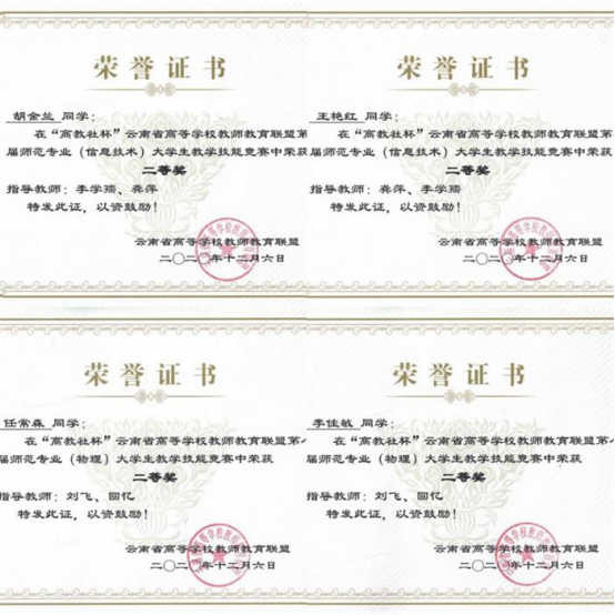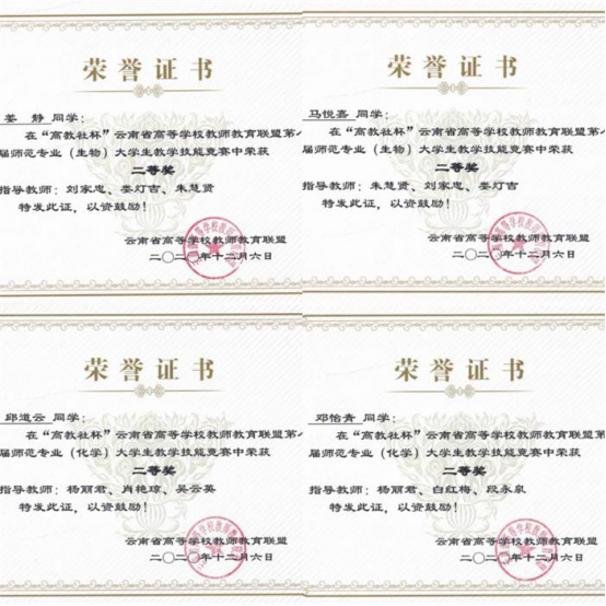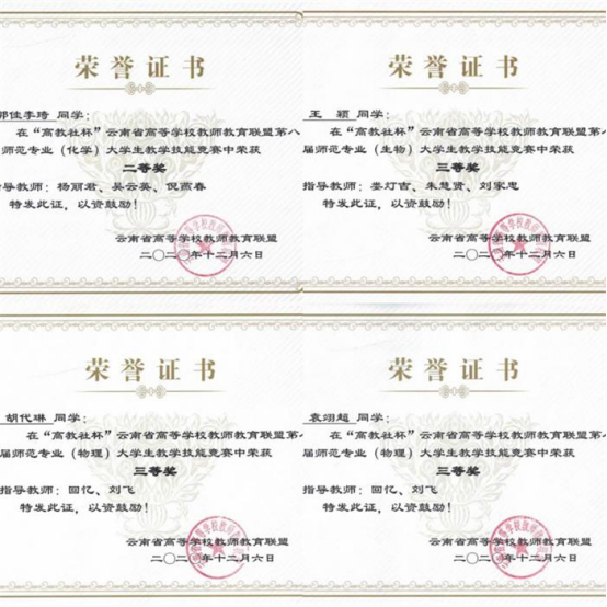 学校认真组织筹备本次比赛,安排指导老师对参赛的学生进行指导。各学院指导教师精心指导学生修改教学设计,带领学生多次磨课,不断提升教学效果。教师教育学院和教务处的老师帮助协调和调试直播设备,保障了在线直播教学和说课竞赛的顺利进行。我校参赛选手教学设计新颖、教学语言自然流畅、教态端庄大方,彰显了我校师范生扎实的教学基本功和过硬的教学能力。经过2天的紧张比赛,我校4个专业的12名选手荣获二等奖9项,三等奖3项。