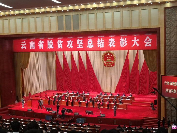 会前,出席会议的领导与受表彰代表合影留念。南海埂会堂报告厅,庄严隆重,气氛热烈。省委书记阮成发出席会议并讲话,省长王予波主持,省政协主席李江出席。省市领导、云南省脱贫攻坚先进个人、云南省脱贫攻坚先进集体代表、帮扶单位代表共2000余人参加了此次大会。