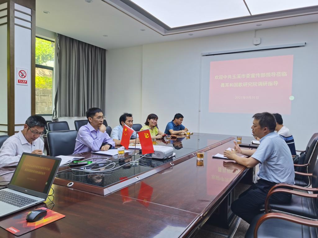 5月31日下午,中共玉溪市委常委、市委宣传部部长梁栋携办公室主任李永华到聂耳和国歌研究院调研指导,马克思主义学院党政领导班子参加活动。