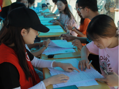 (前来献血的玉师青年在志愿者引导下填写献血登记表)