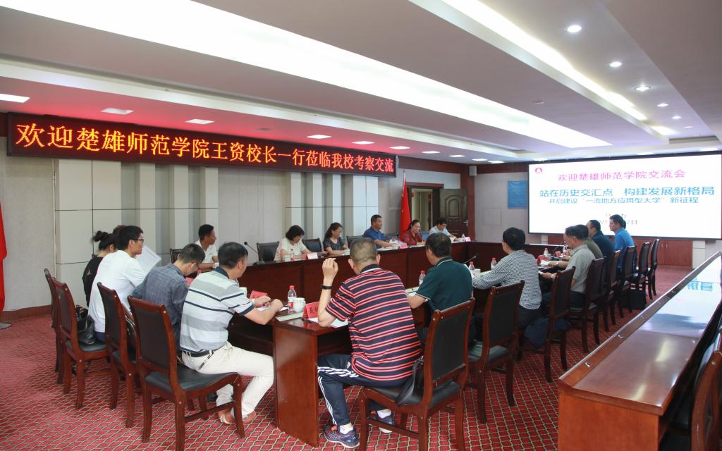 为强化兄弟院校间的交流合作,互相学习取经,携手共同进步,共同推进学科、专业内涵建设,7月2日,楚雄师范学院党委副书记、校长王资,副校长施红星,相关学院(部门)负责同志一行10人到玉溪师范学院考察交流,此次考察交流主要围绕师范类专业二级认证、专业综合评价、学分制改革等方面展开。考察交流座谈会在图书馆3003举行。玉溪师范学院党委副书记、校长马力,党委委员、副校长章新,党委委员、统战部长贾正林,办公室、教务处、体育学院、数信学院、发展规划与研究中心主要负责同志参加座谈。