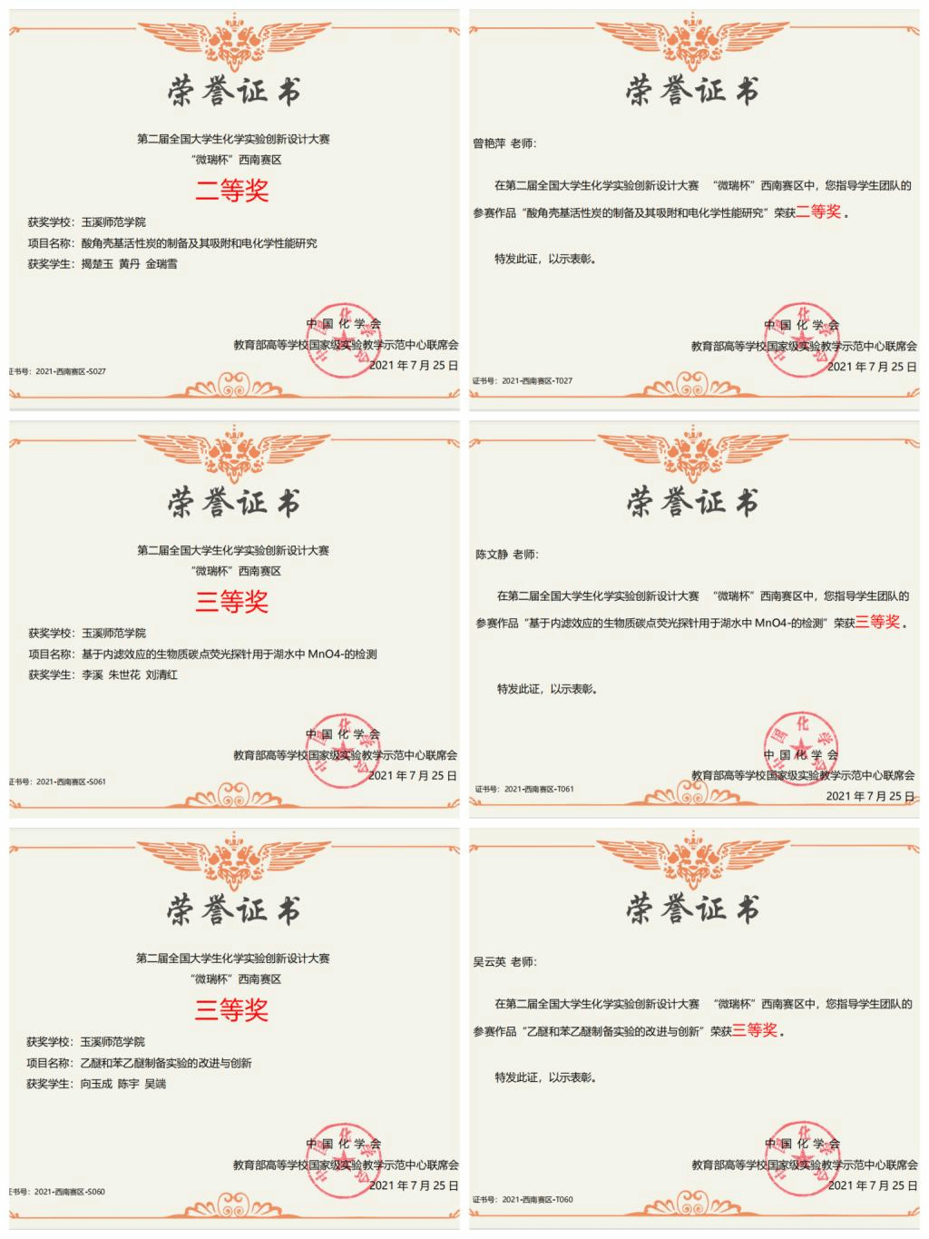7月23日-25日,“微瑞杯”第二届全国大学生化学实验创新设计竞赛西南赛区决赛在四川大学成功举办。经过激烈角逐,我院组建的玉溪师范学院一队(指导教师:曾艳萍,参赛选手:揭楚玉、黄丹、金瑞雪)荣获赛区二等奖,玉溪师范学院二队(指导教师:陈文静;参赛选手:李溪、朱世花、刘清红)、三队(指导教师:吴云英;参赛选手:向玉成、陈宇、吴端)分别荣获赛区三等奖。