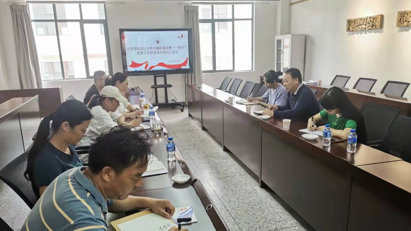 美术学院党委书记杨丽珍汇报了上半年党风廉政建设落实情况及“一把手”监督专项整治情况,党委副书记、院长郭巍及与会人员进行了补充。