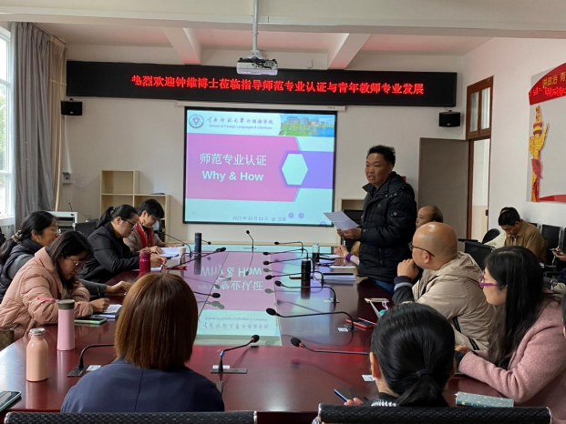 为更好地推进和落实外国语学院正在开展的师范类专业认证准备工作、更好解除青年教师在专业发展方面遇到的疑惑,外国语学院特邀云南师范大学外国语学院副院长钟维博士交流师范认证经验并就青年教师专业发展答疑解惑。