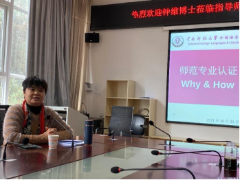 该活动为外国语学院2021年第一场“请进来”活动。活动于2021年10月23日举行,由外国语学院周朝润院长主持,学院全体教师参加。钟维博士为外国语学院开了两场讲座。讲座主题分别为“英语专业师范认证准备工作注意事项”“西部高师院校青年外语教师专业发展:困境与机遇”。