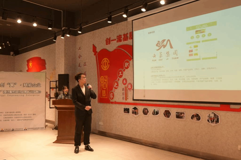 现场,来自玉溪师范学院的14个学生设计团队,向各单位领导、企业负责人汇报了团队的调研过程、设计思路、设计过程和设计方案。设计将传统文化、民族特色与艺术有效融合进企业所需的企业品牌LOGO、包装和宣传册内,充分契合军创企业定位及文化,极具代表与特色,指导教师和企业代表纷纷给予肯定与支持。