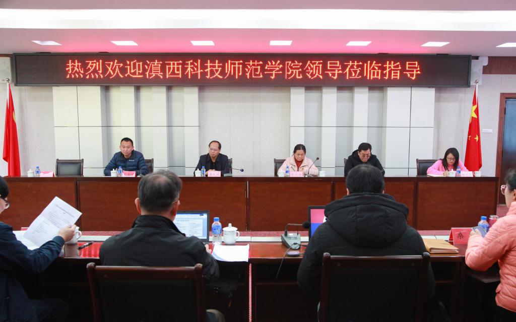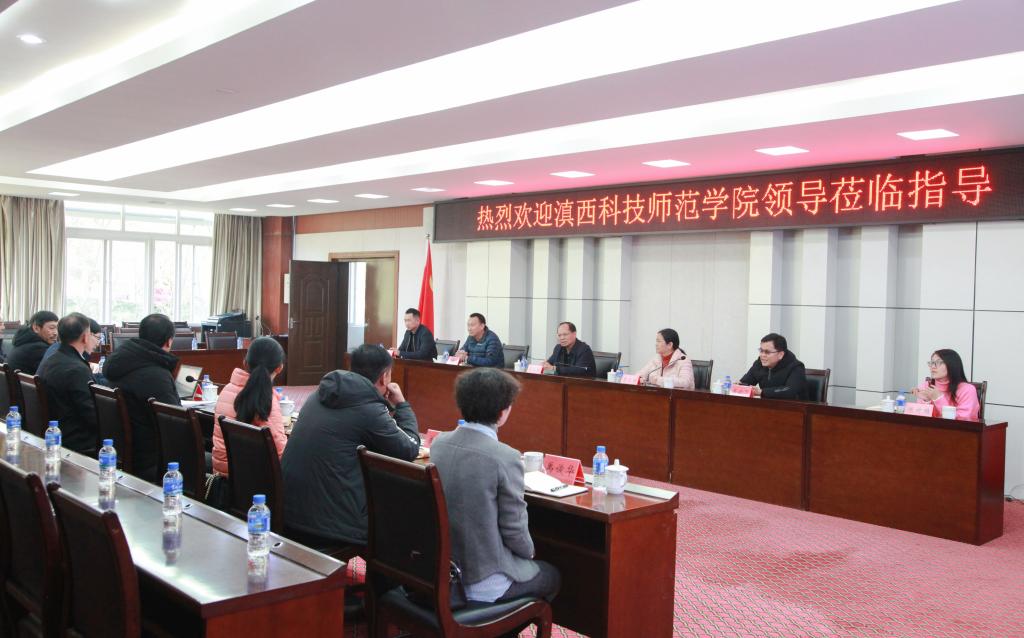 为加强兄弟院校间的交流合作,互相学习取经,携手共同进步,共同推进学校内涵发展,12月3日,滇西科技师范学院校长董大校,教务处处长李红梅,保障管理处处长刘毅恒,教学质量监控与评估中心主任居云飞、副主任陈升雅,校务处秘书二科科长申琛一行6人莅临我校考察交流。
