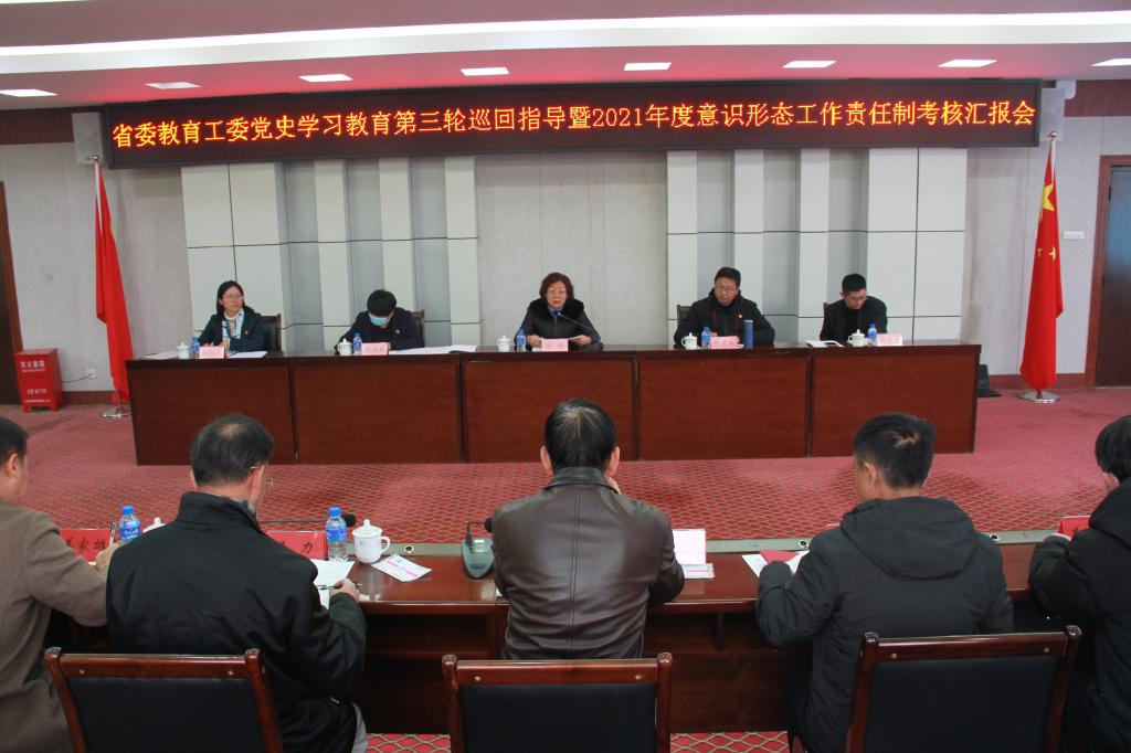 12月20日,省委教育工委党史学习教育领导小组第六巡回指导组组长陶晴一行5人到我校开展党史学习教育第三轮巡回指导工作暨2021年度意识形态工作责任制落实情况考核。上午9点,汇报会在图书馆3003会议室召开。学校党政领导,党史学习教育领导小组成员单位主要负责人,各二级党委书记参加会议。会议由党委书记张学武主持。