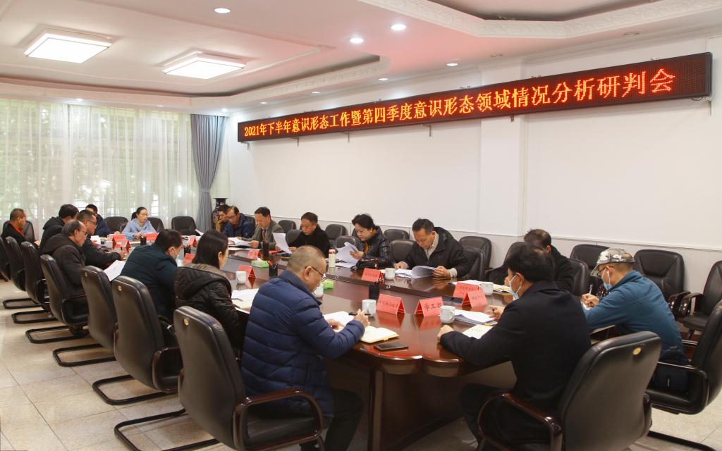 12月30日下午,我校在一办一楼会议室召开2021年下半年意识形态工作暨第四季度意识形态领域情况分析研判会。校党委副书记葛平,校党委委员、宣传部部长、新闻中心主任马恒奕出席会议,各二级党委书记,学工部、保卫处、学报编辑部、网络中心、对外合作交流处主要负责人,党委宣传部相关人员参加会议。会议由葛平主持。
