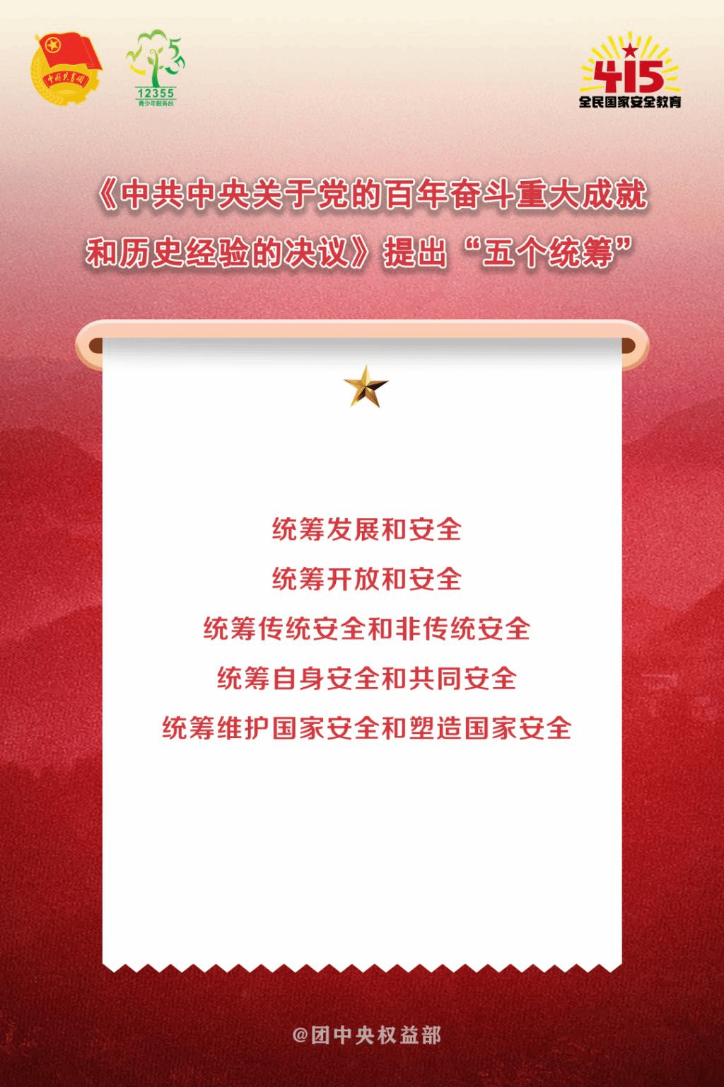 《中共中央关于党的百年奋斗重大成就和历史经验的决议》提出“五个统筹”:统筹发展和安全、统筹开放和安全、统筹传统安全和非传统安全、统筹自身安全和共同安全、统筹维护国家安全和塑造国家安全。