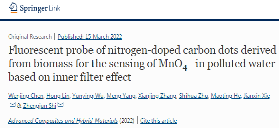 我校云南省高校科技创新团队骨干成员陈文静老师以第一作者、第一单位在著名材料科学期刊Advanced Composites and Hybrid Materials(中国科学院二区,2020年IF=5.693, 2021年即时IF=11.605)上在线发表研究论文“Fluorescent probe of nitrogen-doped carbon dots derived from biomass for the sensing of MnO4−in polluted water based on inner filter effect”,我校谢建新教授和西南林业大学史正军教授为该论文的共同通讯作者,其余作者均为我校师生。