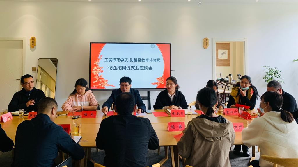 为千方百计开拓就业岗位,积极助力我校毕业生就业。学校坚持“走出去”和“请进来”相结合,邀请勐腊县人民政府副县长贺磊、教育体育局王旭刚一行4人到我校开展访企拓岗促就业活动,并于4月20日在教师教育学院举行座谈交流。副校长章新、杨光,师范类专业相关学院领导参加,学生处处长张春霞主持。