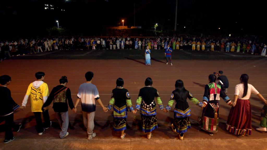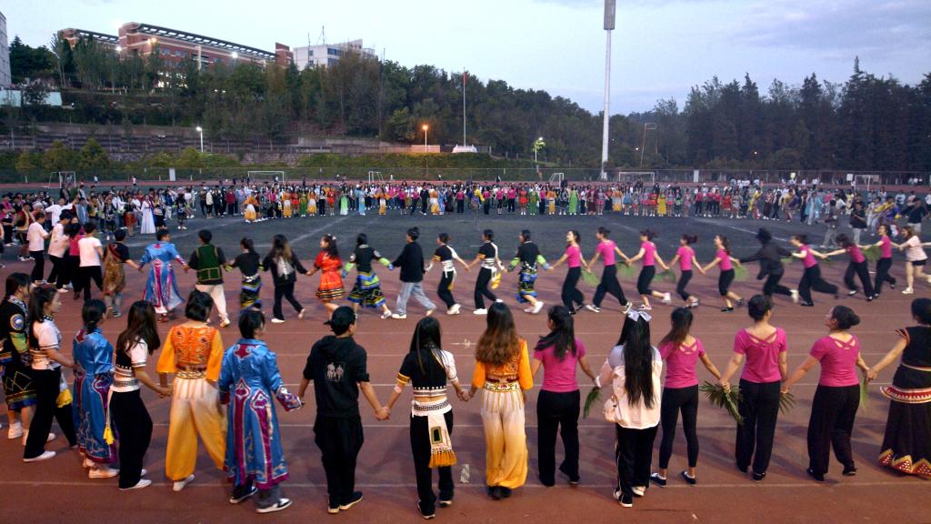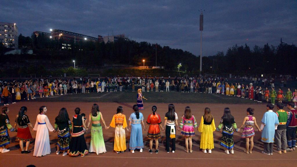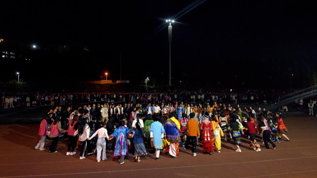 经过师生的共同努力,4月22日晚,2019级音乐学专业学生通过节目《锅庄》,表达了藏族人民对美好生活的向往及共创美好未来的场景;舞蹈学专业学生通过《哈尼棕扇舞》,用优雅的舞姿和欢快的步伐展现了哈尼族乐观向上的生活态度。节目表演结束后,现场师生手牵着手围成圈,在非遗传承人的带领下,在自由奔放的旋律中激情打跳,场面一度达到了高潮。
