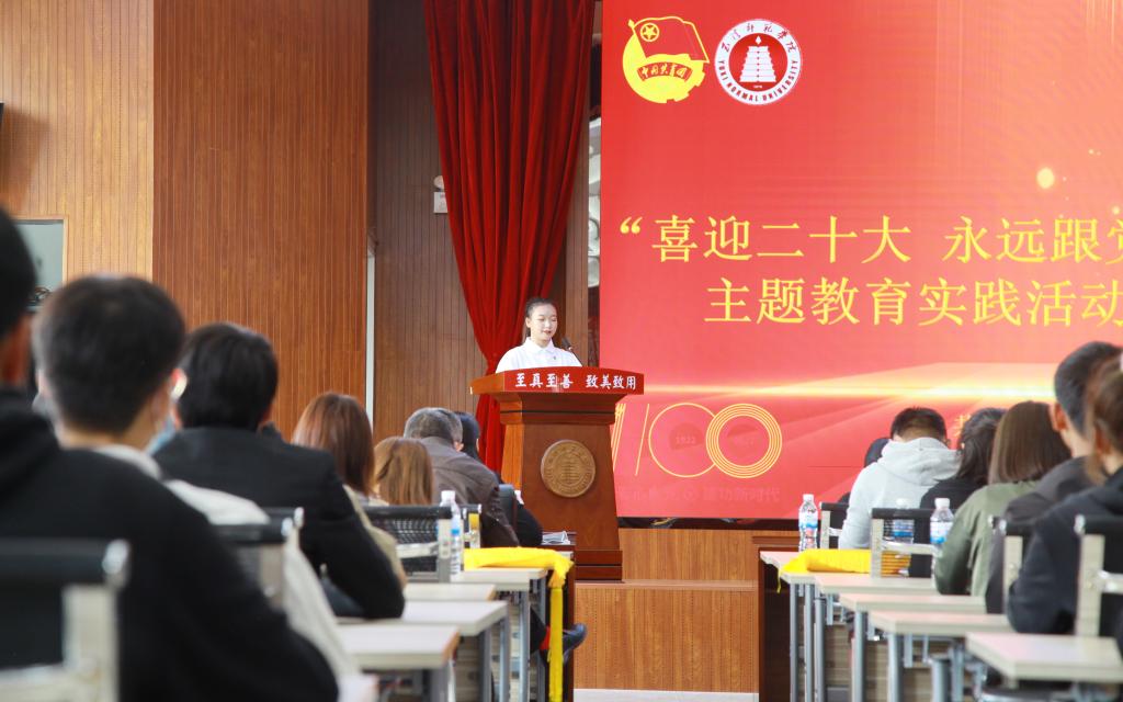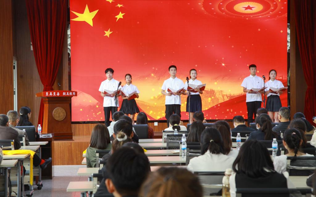 期间,文学院学生吴翼君、郑佳涵、潘祥、卓远義、符筱颖、张云涛为大家带来诗朗诵——《百年青春 当燃有我》,发出了青年学子“请党放心 强国有我”的青春誓言。