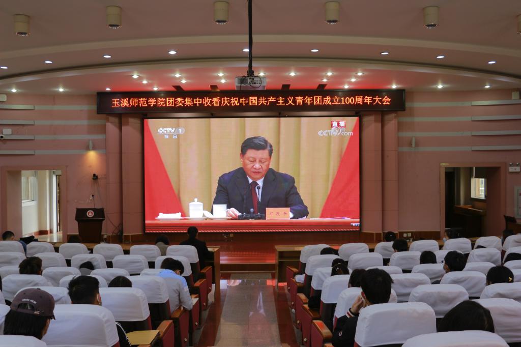 玉溪师范学院团委设立主会场和分会场,广泛组织团员青年和团干部观看大会。玉溪师范学院团委班子成员、各二级学院团委书记以及各学院学生代表共112人在主会场科学讲堂集中观看大会实况直播,各二级学院设立分会场,团员青年、团干部通过网络、电视等多渠道收听收看。