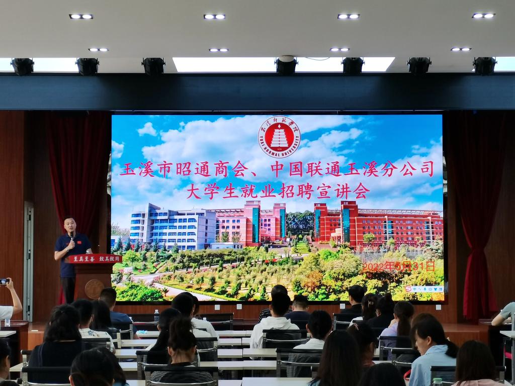 5月31日,玉溪师范学院与玉溪市昭通商会联合举办校园专场招聘会。玉溪市昭通商会组织15家会员企业及中国联通玉溪分公司走进大学校园,开展现场招聘活动。