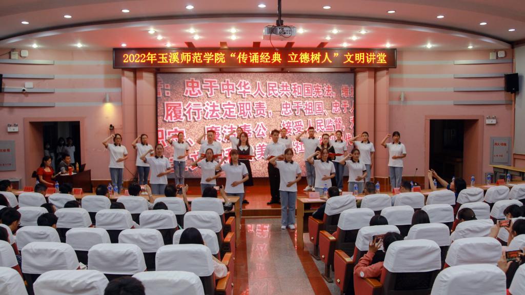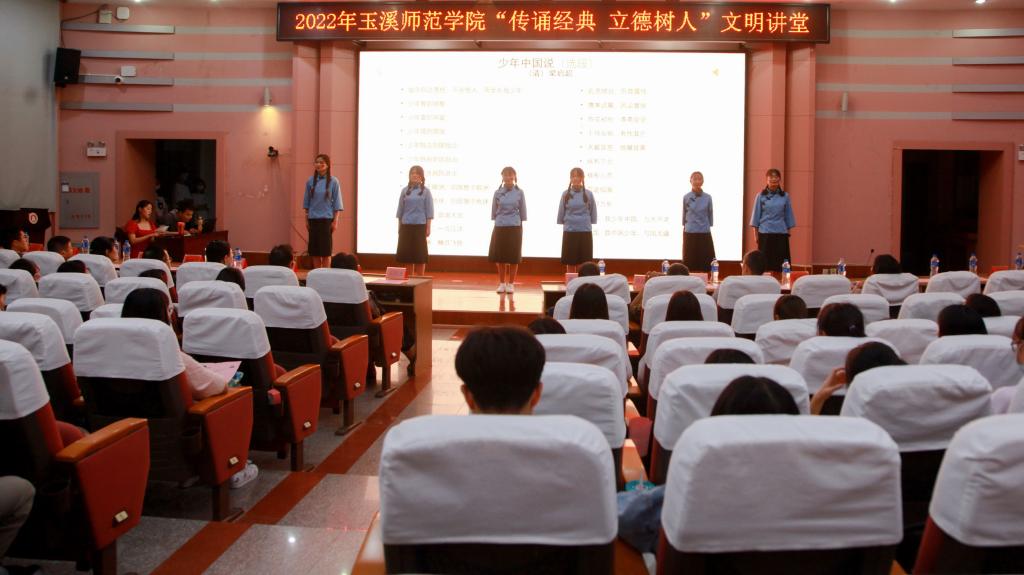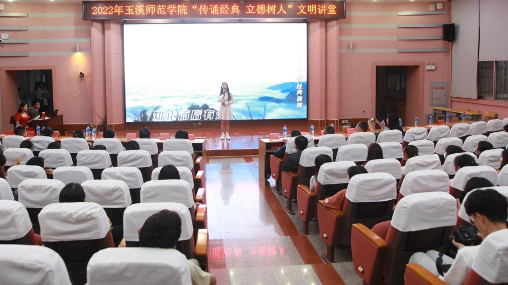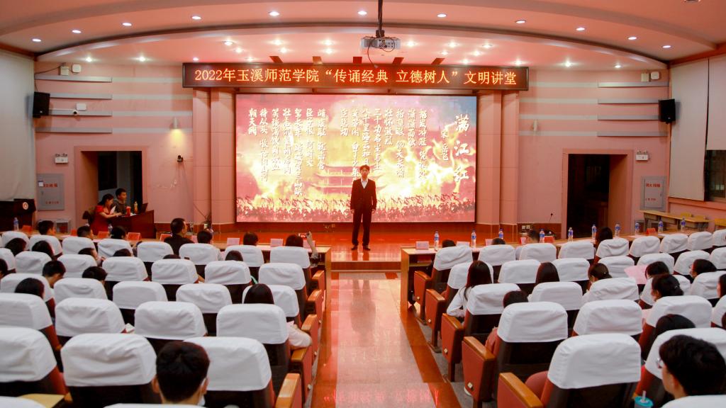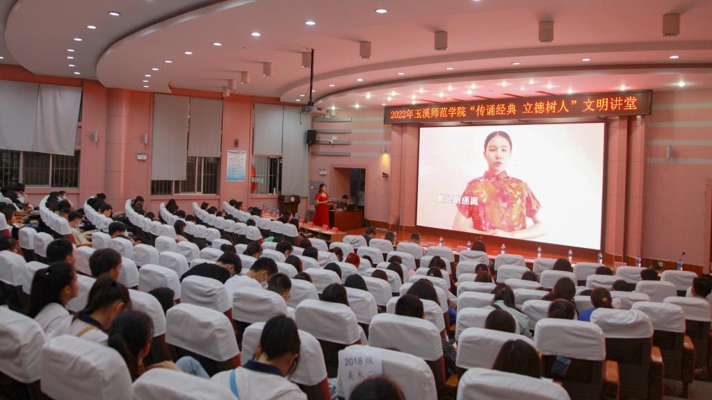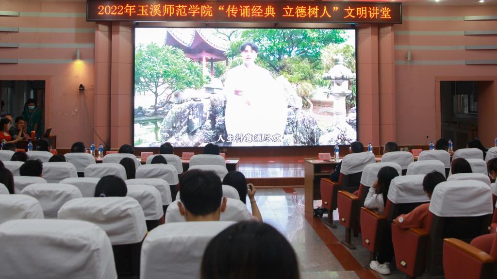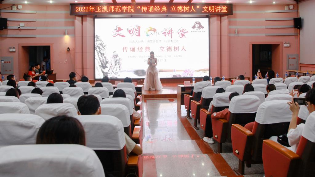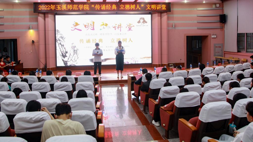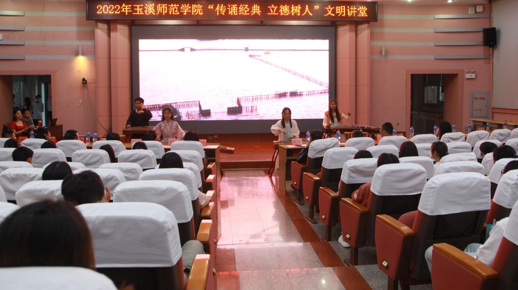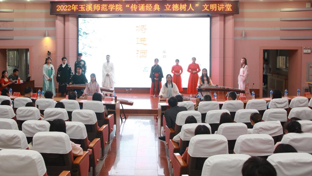 6月17日,由党委宣传部主办,法学院、音乐学院联合承办,以“传诵经典 立德树人”为主题的文明讲堂在学校科学讲堂举行。作为“五个一”特色育人实践之“办一场讲堂”活动,旨在弘扬中华优秀传统文化,培育品学兼优的新时代人才。本期文明讲堂在前期系列活动基础上,整合精品内容,创新表现形式,有机融合了诗文诵读、乐器演奏、歌唱吟咏、故事讲述、视频录制等各种表现样式,生动展现了耀眼的中华文化,深深濡染了现场的玉师学子。