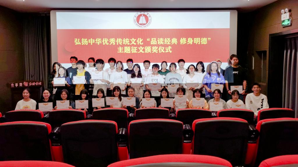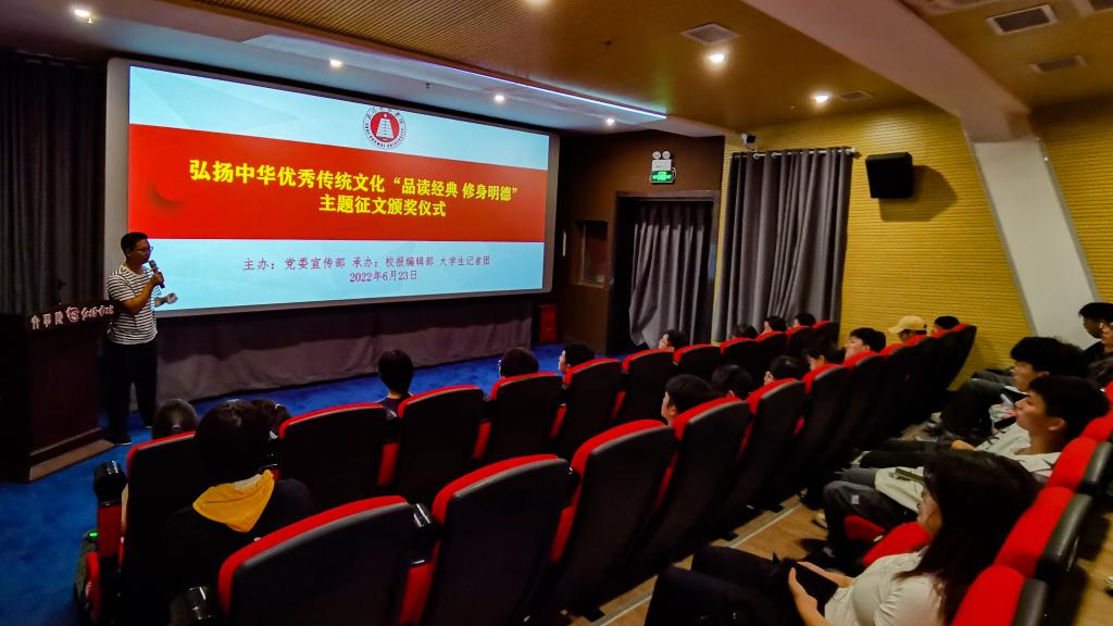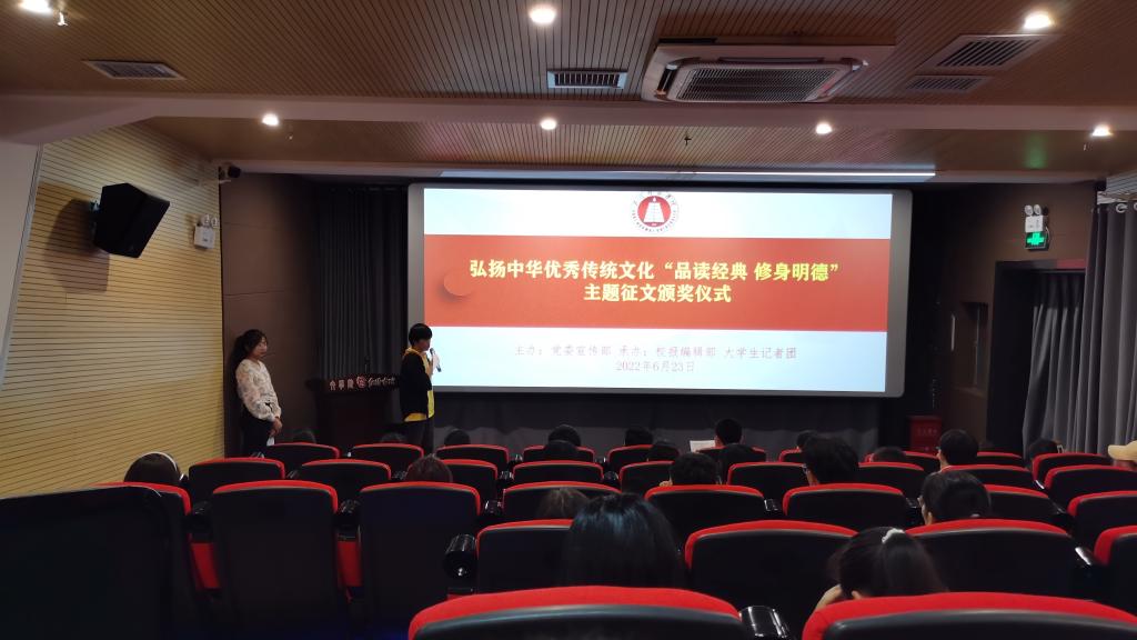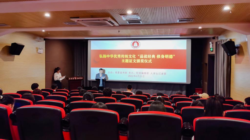 6月23日下午,由宣传部主办,校报编辑部、大学生记者团共同承办的弘扬中华优秀传统文化“品读经典 修身明德”主题征文活动颁奖仪式在红塔书院举行。文学院罗云博士,宣传部廖鹏飞、董正福老师,来自各学院50余名获奖学生参加仪式,仪式由大学生记者团普舒同学主持。
