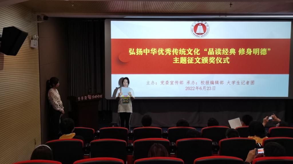 为加强中华优秀传统文化教育,深入推进我校思政教育形式多样化和立体化发展。2022年春季学期,学校宣传部携手各学院围绕“课程思政”校本教材《诵读选本》,开展“诵一首诗词”“讲一个故事”“唱一支歌曲”“写一篇文章”“办一场讲堂”五种育人实践系列活动。