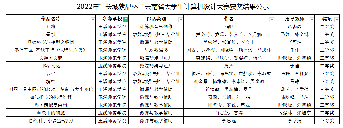 根据《关于举办2022年“长城紫晶杯”云南省大学生计算机设计大赛的通知》的规定和要求,2022年6月云南省大学生计算机设计大赛评审委员会秉着“公开、公平、公正、择优”的原则,经网络评审、现场决赛、会议审核确定,共评选出一等奖27项,二等奖108项,三等奖267项,团体奖6项,组织奖1项。我校上推25项作品参赛,获二等奖3项,三等奖10项。