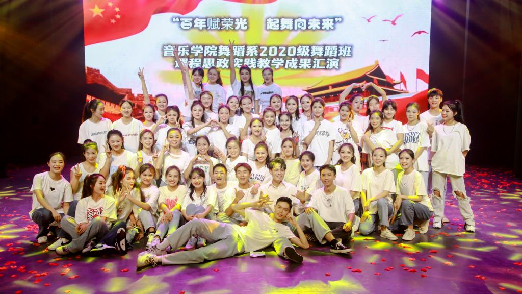喜迎二十大,永远跟党走,建功新时代;青春心向党,百年赋荣光,起舞向未来!为追忆光辉历史,传承红色基因,续写奋斗精神,激励广大青年学生踔厉奋发,笃行不怠。6月30日晚,音乐学院在艺术教育中心三楼实训剧场举行喜迎二十大系列活动:“百年赋荣光 起舞向未来”——2020级舞蹈学班课程思政实践教学成果汇报演出。