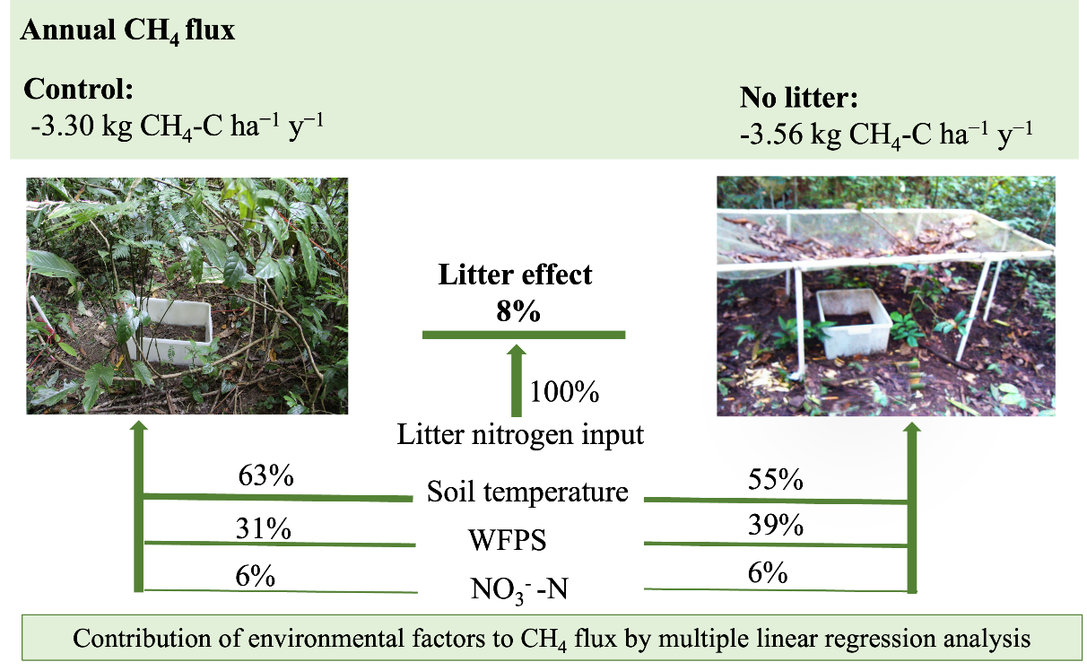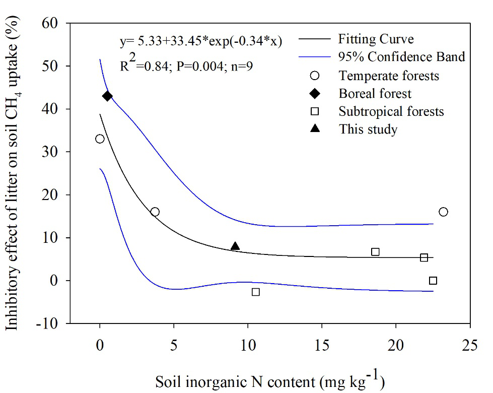 热带雨林原位研究结果表明:(1)凋落物减少了8%的CH4汇;(2)凋落物的移除并没有改变CH4汇的影响因子;(3)凋落物输入的无机氮对CH4的吸收具有显著的相关关系,表明凋落物淋洗液和分解释放的氮是调节热带森林CH4排放的主要影响因子之一。其次,整合全球多点研究结果表明森林生态系统中,CH4吸收受凋落物收入到土壤无机氮的影响显著。