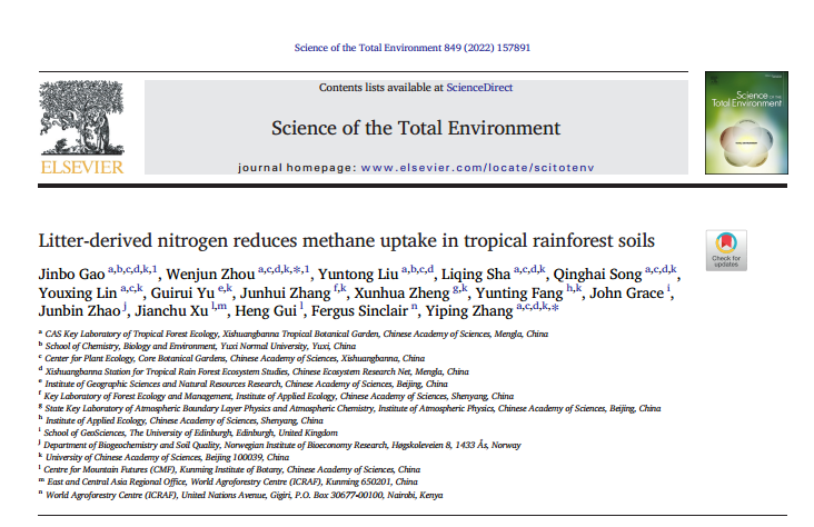 凋落物是森林土壤养分的重要来源在森林,土壤碳氮循环过程中扮演重要的角色。凋落物的输入动态及其分解过程不仅显著的影响了土壤有机质输入和N2O排放,同时也改变土壤的水热条件并调控土壤-大气界面的气体扩散,对土壤CH4的动态有着重要影响,需进行深入研究。为明确凋落物对热带雨林土壤CH4的影响和凋落物输入及分解过程氮输入对土壤CH4排放的调控机制,我校高进波博士与合作团队以西双版纳热带雨林为研究对象,并整合全球多点研究开展了热带雨林土壤CH4排放的持续研究。