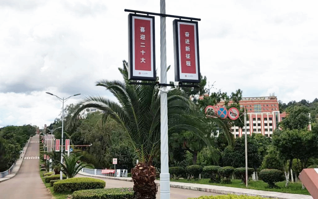 学校东大门入口处首个路灯灯箱内容已更新为“喜迎二十大奋进新征程”的宣传标语,为迎接党的二十大胜利召开营造浓厚氛围。