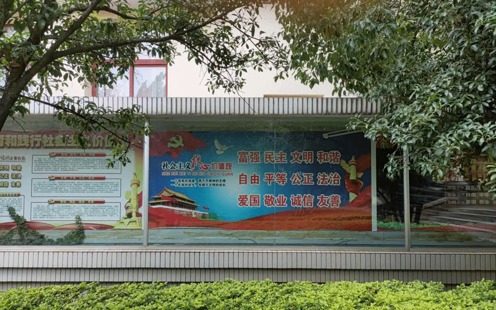 外国语学院右侧路旁的宣传栏更新为:以“创建文明校园优化育人环境”和“社会主义核心价值观”为主题的展示内容,展现我校在创建文明校园和校园文化方面作出的成果和建树。