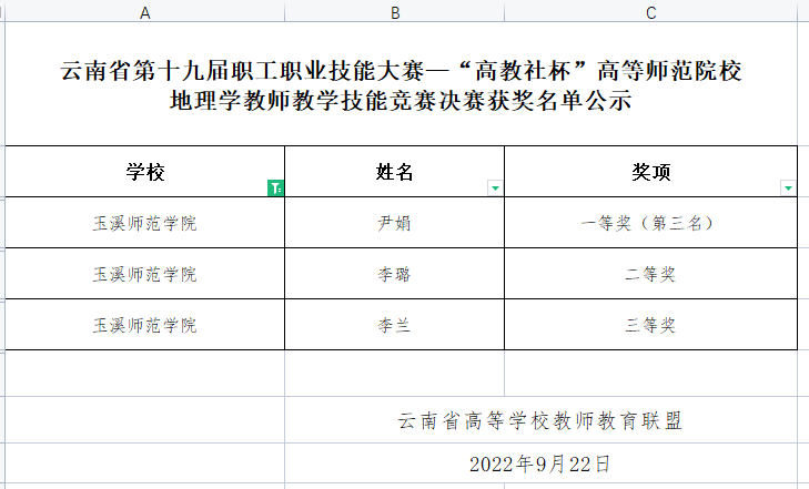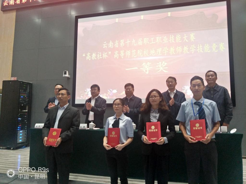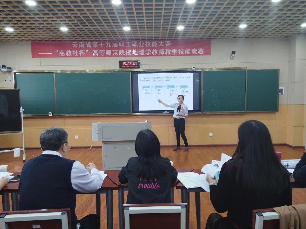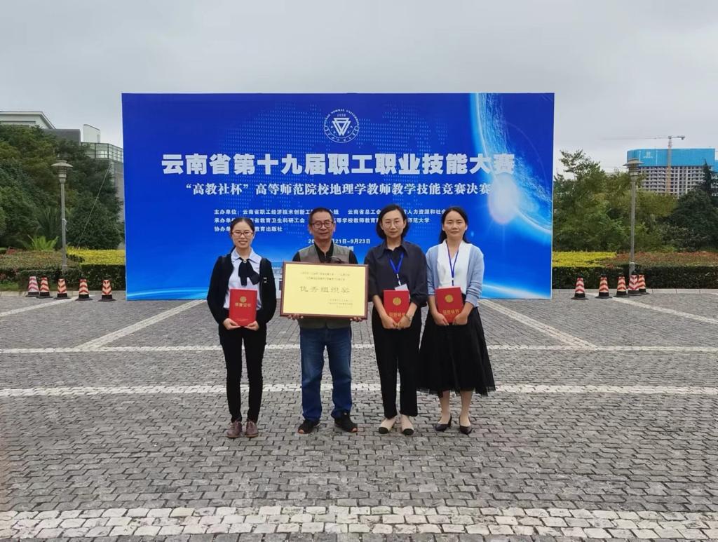 云南省第十九届职工职业技能大赛“高教社杯”高等师范院校地理学教师教学技能竞赛决赛于2022年9月21日至9月23日在云南师范大学举行。我校地理与国土工程学院地理学类专业尹娟、李璐、李兰3位教师分别获一等奖、二等奖、三等奖;我校获得优秀组织奖。
