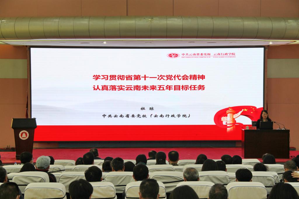 杜琼老师以《学习贯彻省第十一次党代会精神认真落实云南未来五年目标任务》为题,解读了省第十次党代会以来云南发展取得的成就,分析了云南发展存在的问题差距、机遇优势、重点任务,明确了云南省发展的奋斗目标,为推动云南省经济高质量发展,构建现代化经济体系以及加强边疆民族地区治理能力现代化理清工作思路。