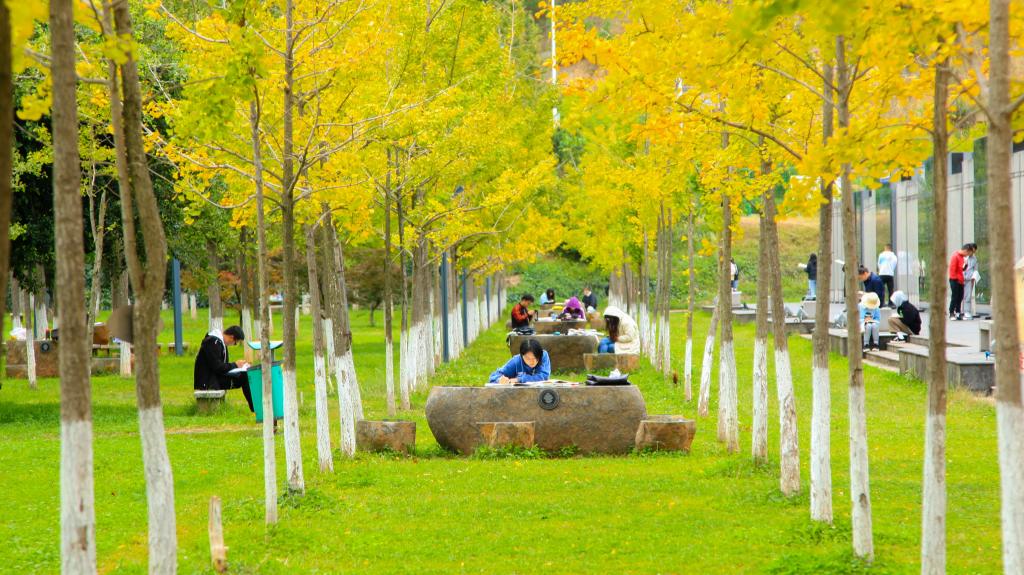 玉师校园不算大,读书、学习的地方却很多!且不说宽敞明亮的室内场所,学校图书馆前银杏林内、悠悠湖边、博思湖畔……都是同学们读书、学习的好去处,但最受同学们偏爱的,莫过于图书馆门前的银杏林了。