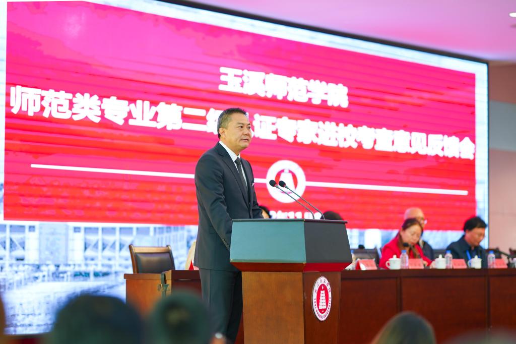 玉溪师范学院党委书记姜家雄致欢迎辞。姜家雄表示,开展师范专业认证,是新时期国家振兴教师教育、提高师范人才培养质量的重要举措。学校坚持以习近平新时代中国特色社会主义思想为指导,落实立德树人根本任务,推进师范专业认证,提高人才培养质量。此次专家组的到来,是对学校师范专业的全面检验,必将推动学校办学质量再上新台阶。学校将全力配合,敬请专家们多提意见,帮助学校查找短板、诊断问题、持续提升。