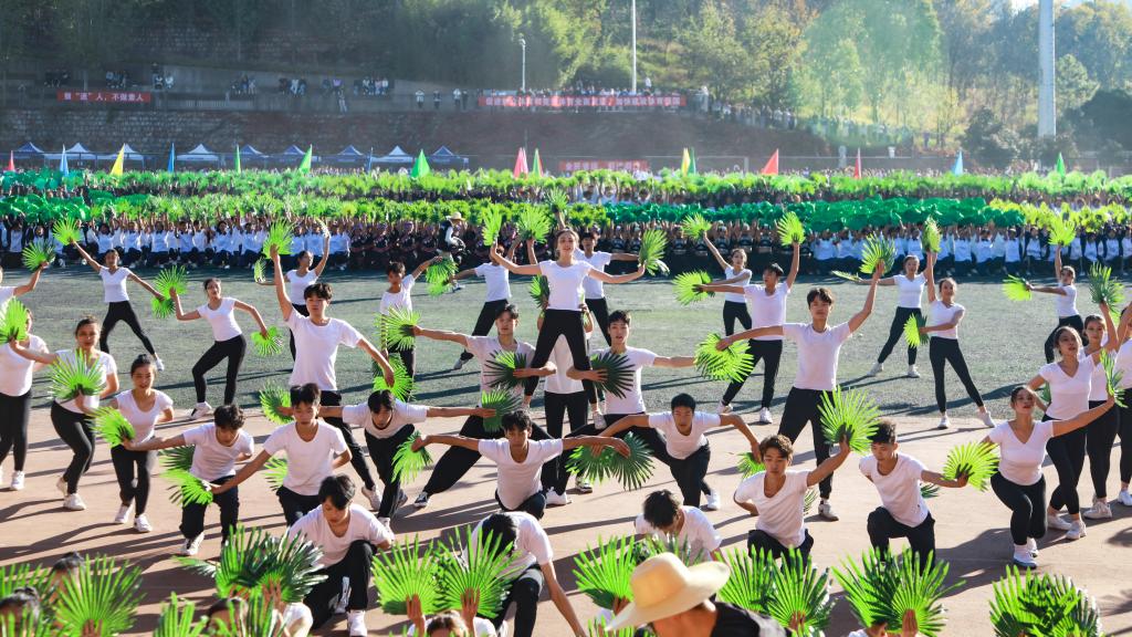 千人哈尼棕扇健身操展演方队随后为大家带来了精彩的现场展演,竹竿舞表演方队与现场师生热情互动,人潮涌动,欢呼阵阵,整个运动场汇成了欢乐的海洋,气氛达到最高潮。未来几天时间里,玉师运动健儿们将在赛场上尽情挥洒汗水,展现自我,逐梦省运,赛出水平,赛出风采。