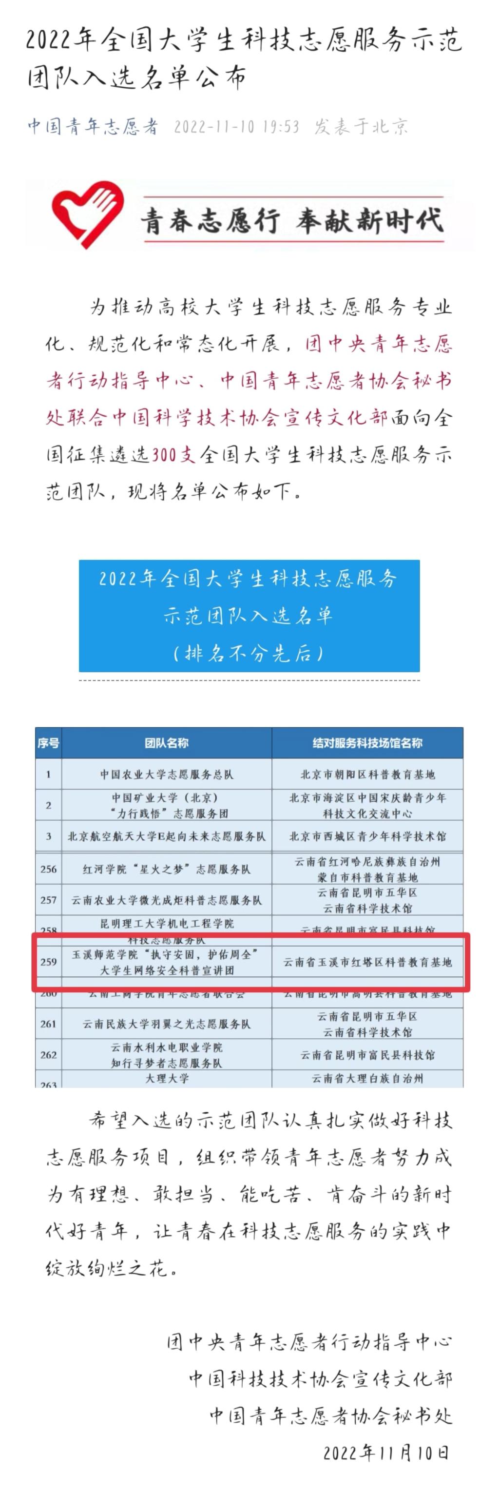 为推动高校大学生科技志愿服务专业化、规范化和常态化开展,团中央青年志愿者行动指导中心、中国青年志愿者协会秘书处联合中国科学技术协会宣传文化部面向全国征集遴选300支全国大学生科技志愿服务示范团队。我校“执守安固,护佑周全”大学生网络安全科普宣讲团从全国近千支队伍中脱颖而出,成功入选示范团队。