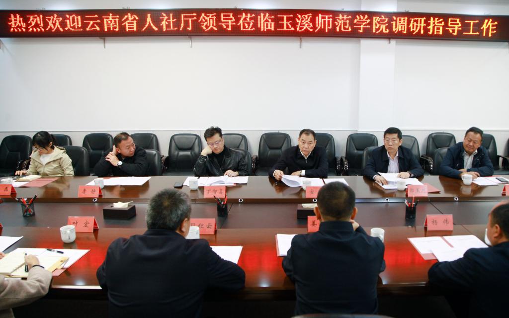 玉溪市人力资源和社会保障局副局长温进武、办公室相关人员,玉溪师范学院党政主要领导、分管人事工作校领导,办公室、人事处、教师中心有关负责人参加,调研座谈会在学校一办一楼会议室举行。玉溪师范学院党委书记姜家雄主持会议。