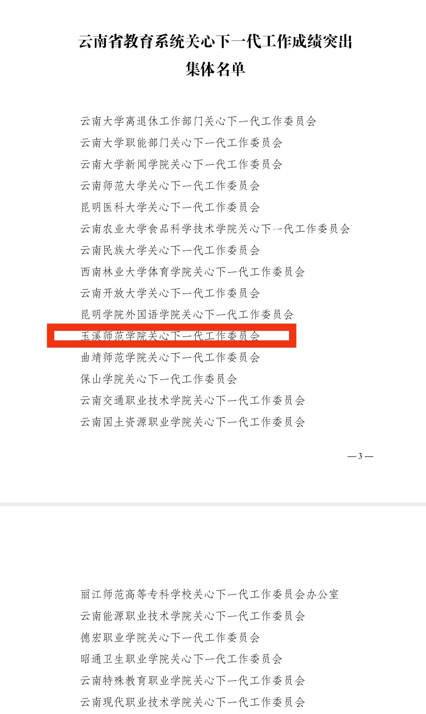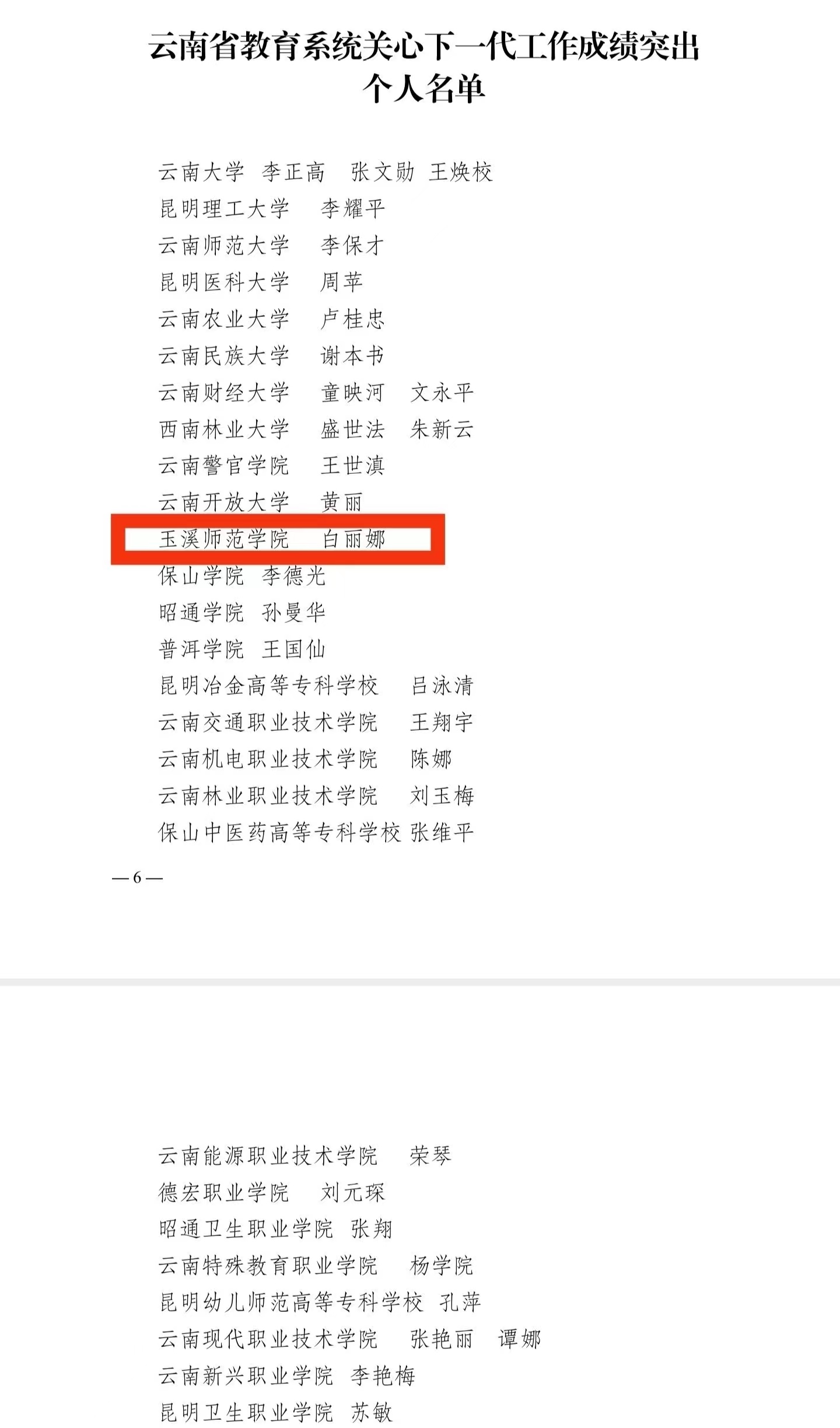近日,云南省教育厅关心下一代工作委员会印发《关于表扬云南省教育系统关心下一代工作成绩突出集体和个人的通报》,我校关工委获评“云南省教育系统关心下一代工作成绩突出集体”,我校教师教育学院关工委委员白丽娜被评为“云南省教育系统关心下一代工作成绩突出个人”。