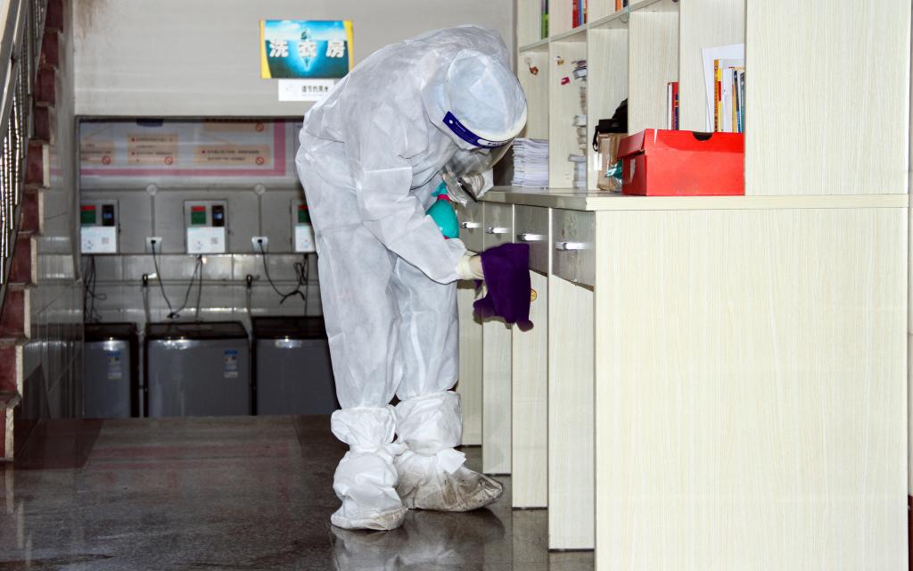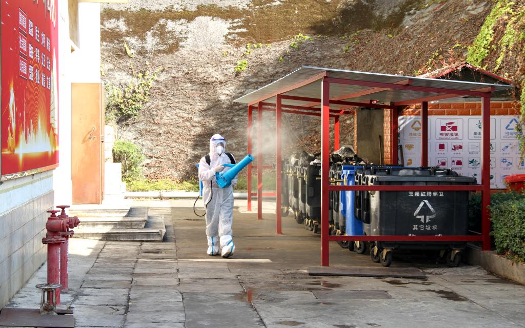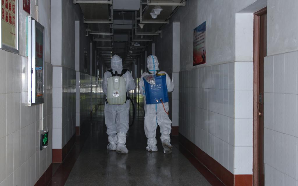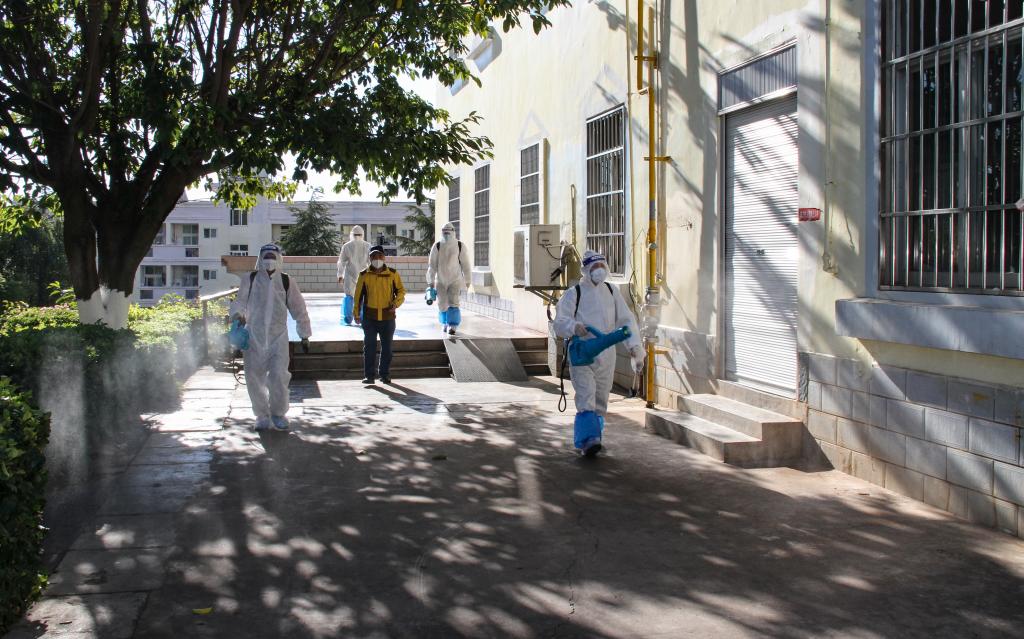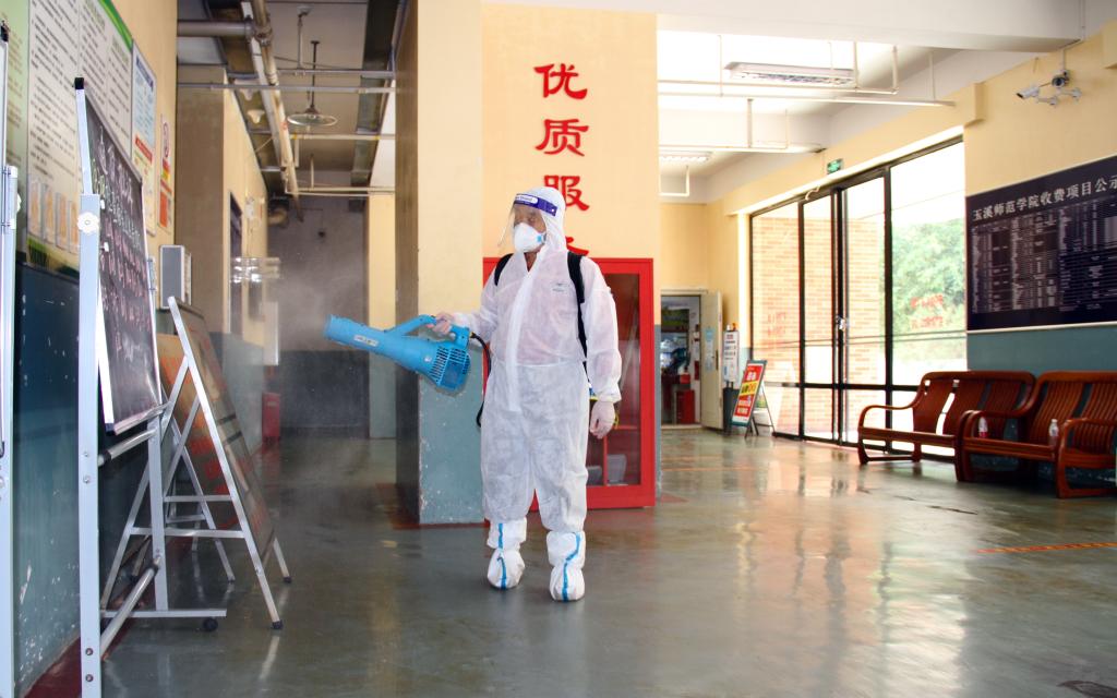 在学校后勤服务中心的统筹下,来自玉溪猎鹰有害生物防治有限公司的10余名工作人员身穿防护服、手持喷雾器、背负消毒水,车载强力风筒喷雾器,分为3个小组对学校办公、学习、生活等区域进行卫生消杀。