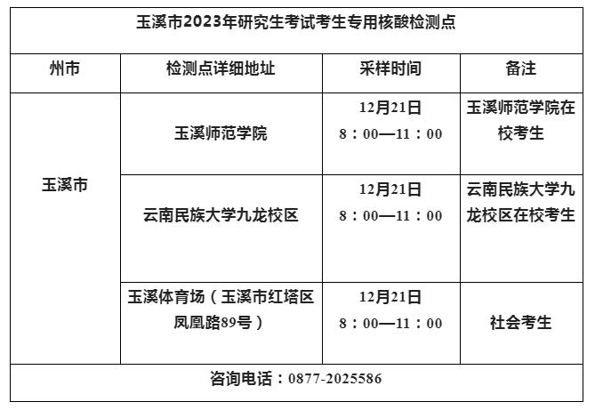 2023年全国硕士研究生招生考试(初试)将于12月24日至26日举行。根据教育部、省市决策部署,本次考试为聚集性重大活动,考点为特定场所,考试工作人员和考生核酸检测需应检尽检。为确保核酸检测顺利及时出结果,玉溪市专门设置研考考生核酸采集专用点,为参加研考的考生提供核酸检测绿色通道,免费进行核酸检测。(具体核酸检测点安排见下表)