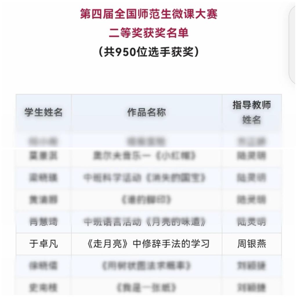 近日,第四届全国师范生微课大赛公布获奖名单。我校教师教育学院共20位同学参加本次比赛,11位同学共取得特等奖1个、一等奖9个和二等奖1个的优异成绩。学前教育系杨孝琴同学荣获特等奖,学前教育系的石晶琦、庞智袁、周小香、李晶晶、王妍鳕、蒲克蓉同学,小学教育系的施婧和万晓彤同学,教育技术系程孟延同学荣获一等奖;小学教育系的于卓凡同学荣获二等奖。