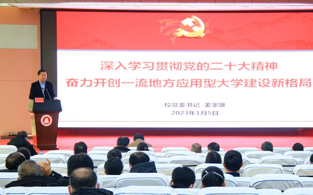 姜家雄指出,学习宣传贯彻党的二十大精神,要全面对照党的二十大战略部署,紧扣学校第三次党员代表大会确定的目标任务,以加速内涵式高质量发展为主导,以硕士学位授予单位建设为引领,以应用型人才培养为目标,以“人才强校”“学术兴校”为核心,以“一流特色本科”建设为根本,以“科技服务地方”为重点,以基层党组织建设为保障,以“四个坚持”为引领,将十项重点任务落实落细,开创学校一流地方应用型大学建设新局面。