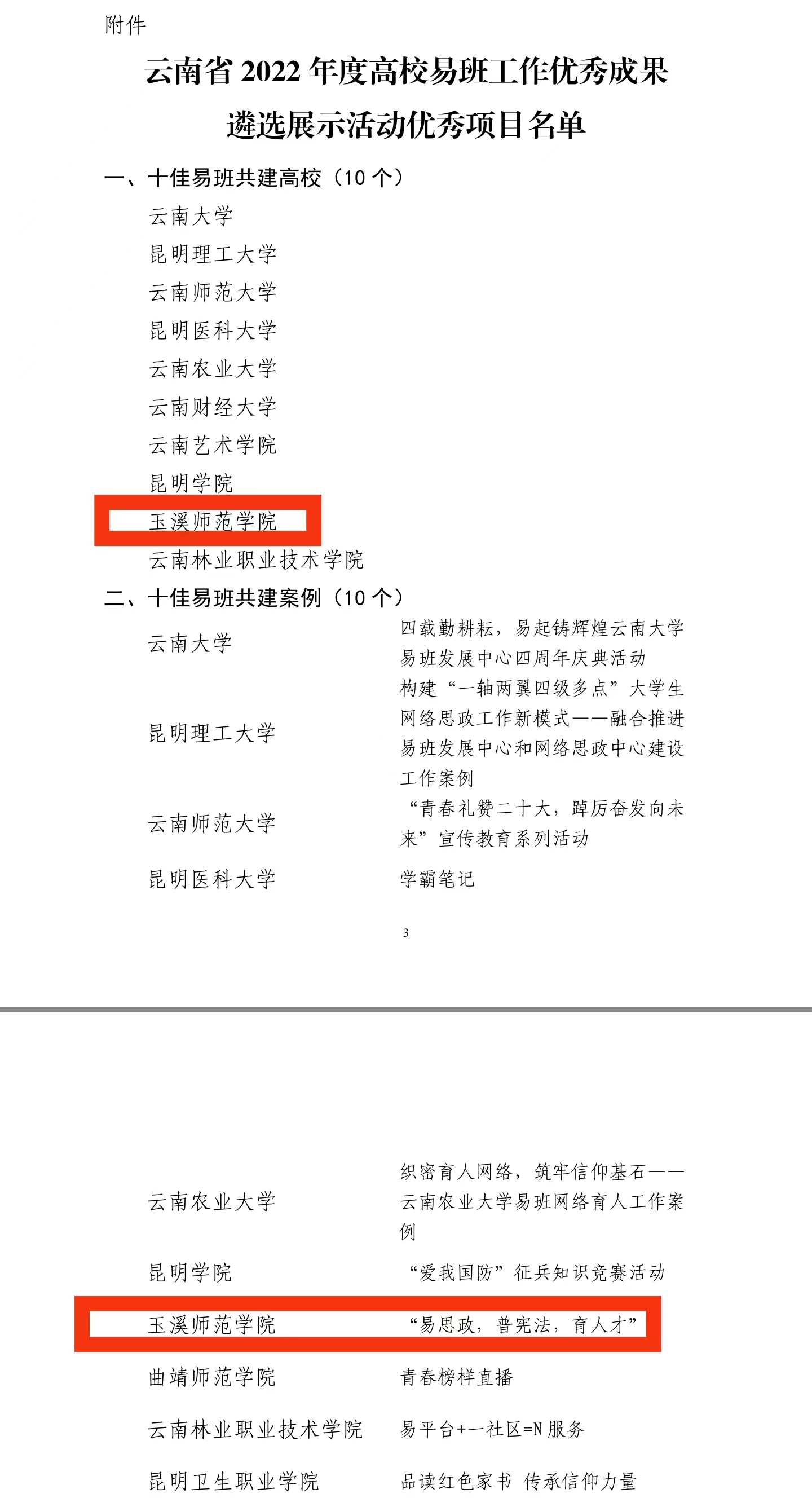 近日,云南省高校易班发展中心公布了云南省2022年度高校易班工作优秀成果遴选展示活动结果,我校入选2022年度云南省“十佳易班共建高校”;法学院易班工作案例“易思政,普宪法,育人才”入选“十佳易班共建案例”;商学院马艳琼老师荣获“十佳易班辅导员”称号;校易班学生工作站站长孙明惠同学荣获“十佳易班工作站站长”称号。