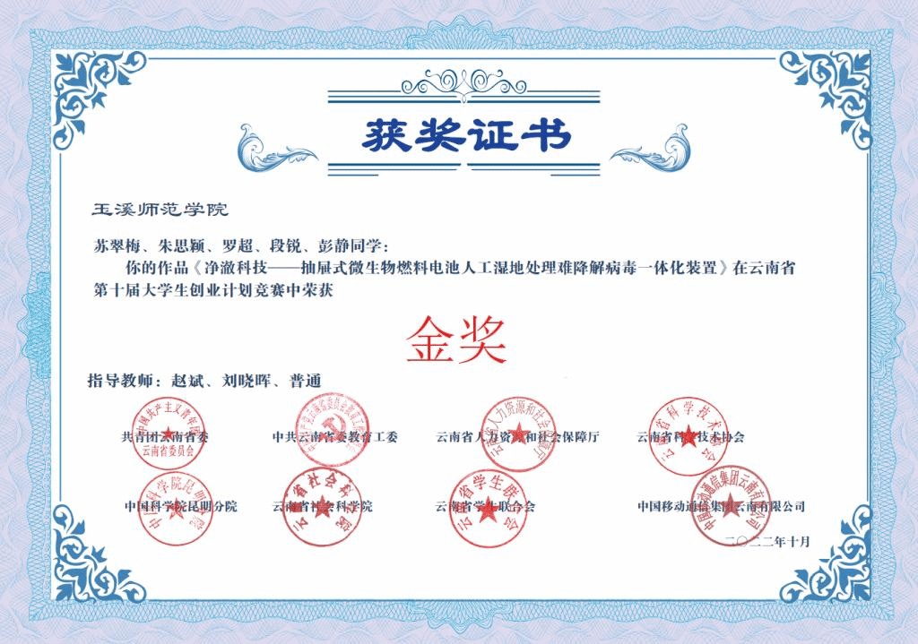 化学生物与环境学院赵斌团队“净澈科技—抽屉式微生物燃料电池人工湿地处理难降解病毒一体化装置”项目获金奖