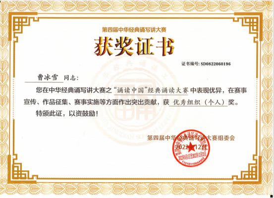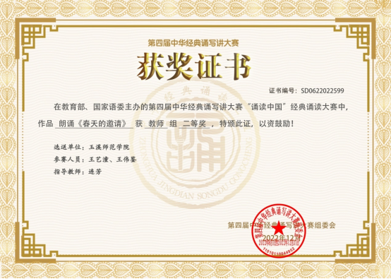 雅言传承文明,经典浸润人生。日前,由教育部、国家语委主办的第四届中华经典诵写讲大赛全国总决赛获奖名单公布,我校云南省国家通用语言文字推广基地骨干成员、文学院教师王艺潼参赛作品《春天的邀请》,获得第四届中华经典诵写讲大赛“诵读中国”经典诵读大赛中荣获国家级教师组二等奖;玉溪师范学院云南省国家语言文字推广基地负责人、校语委办主任曹冰雪荣获全国优秀组织奖。