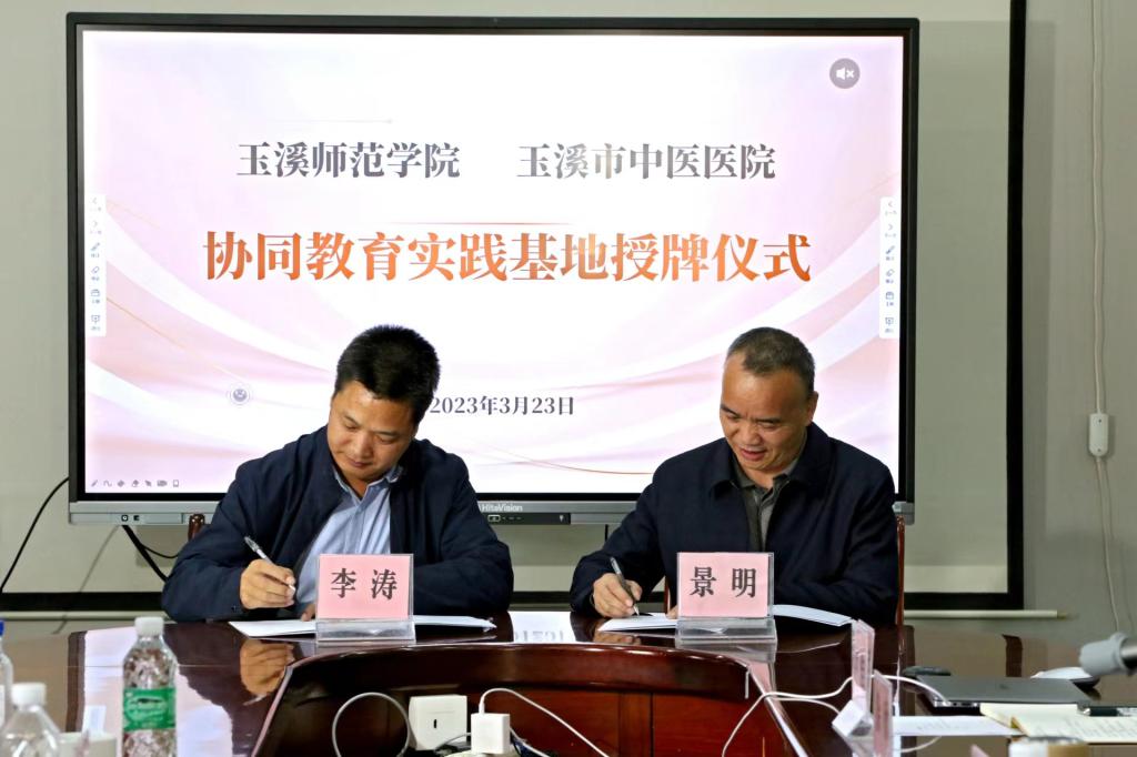 2023年3月23日下午,玉溪市中医医院与玉溪师范学院举行协同教育实践基地授牌仪式。玉溪师范学院副校长李涛、体育学院党委书记杨志龙等一行五人前往玉溪市中医医院参加本次签约仪式。玉溪市卫生健康委副主任杨坤、玉溪市中医医院院长景明、党委副书记余鲲、副院长徐欣、康复科主任杨晓燕,以及中医院各职能部门负责人及各相关科室业务骨干出席本次仪式,授牌仪式由玉溪市中医医院党委书记张燕华主持仪式。