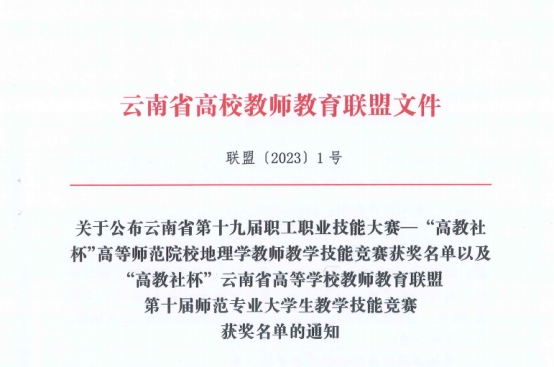 云南省第十九届职工职业技能大赛——“高教社杯”高等师范院校地理学教师教学技能竞赛已顺利结束。最终评选出一等奖4名,二等奖6名,三等奖6名,3家优秀组织奖单位。我校地理与国土工程学院地理学类专业尹娟、李璐、李兰3位教师分别获一等奖、二等奖、三等奖;我校获得优秀组织奖。