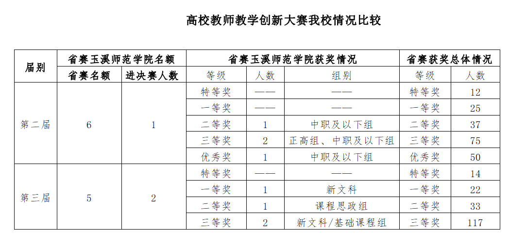 参赛教师们认真准备,精心打磨,经网络初评和现场决赛两个环节,我校胡晓东获新文科组一等奖、阳利永获课程思政组二等奖、尹娟获新文科组三等奖、曾艳萍获基础课程组三等奖。与上届创新大赛相比,我校进决赛的人数比例从 16.7% 增至 40%、获奖人数比例从 66.7 增至 80%,获奖等级有明显提高。详情见下表: